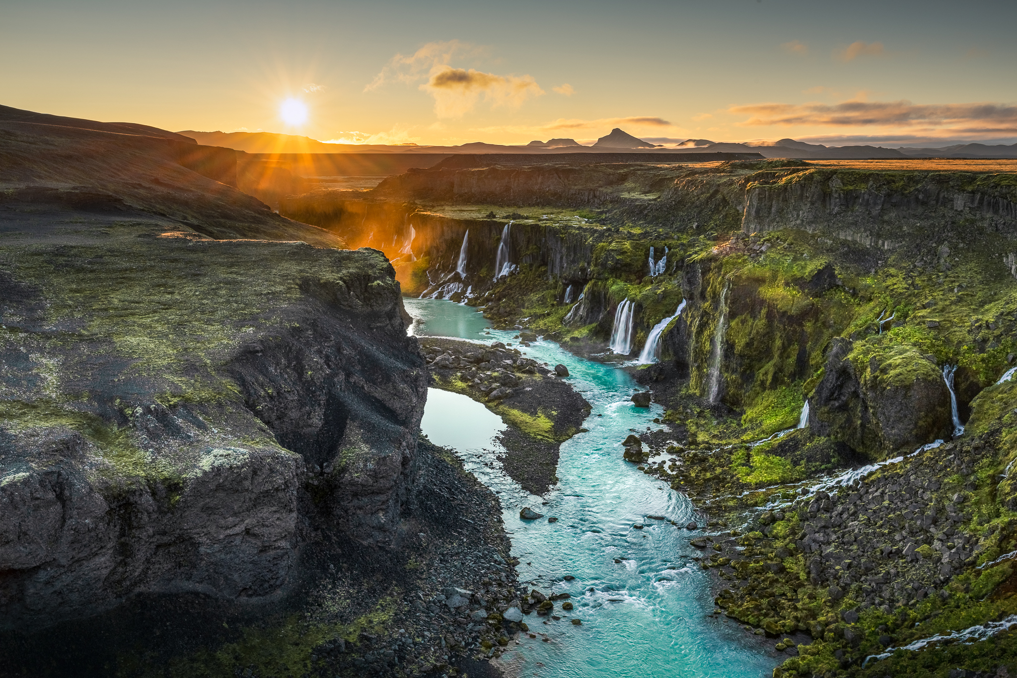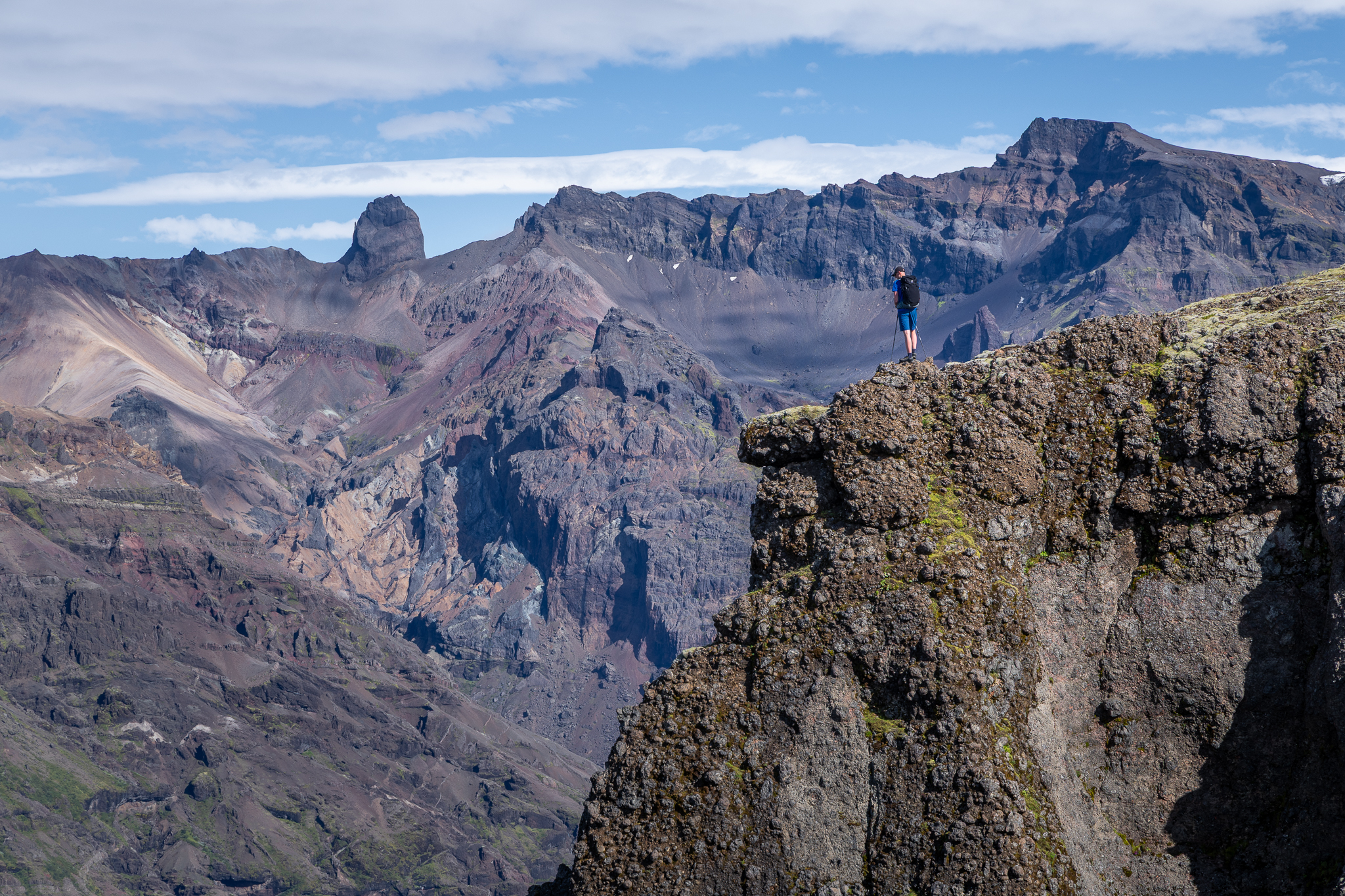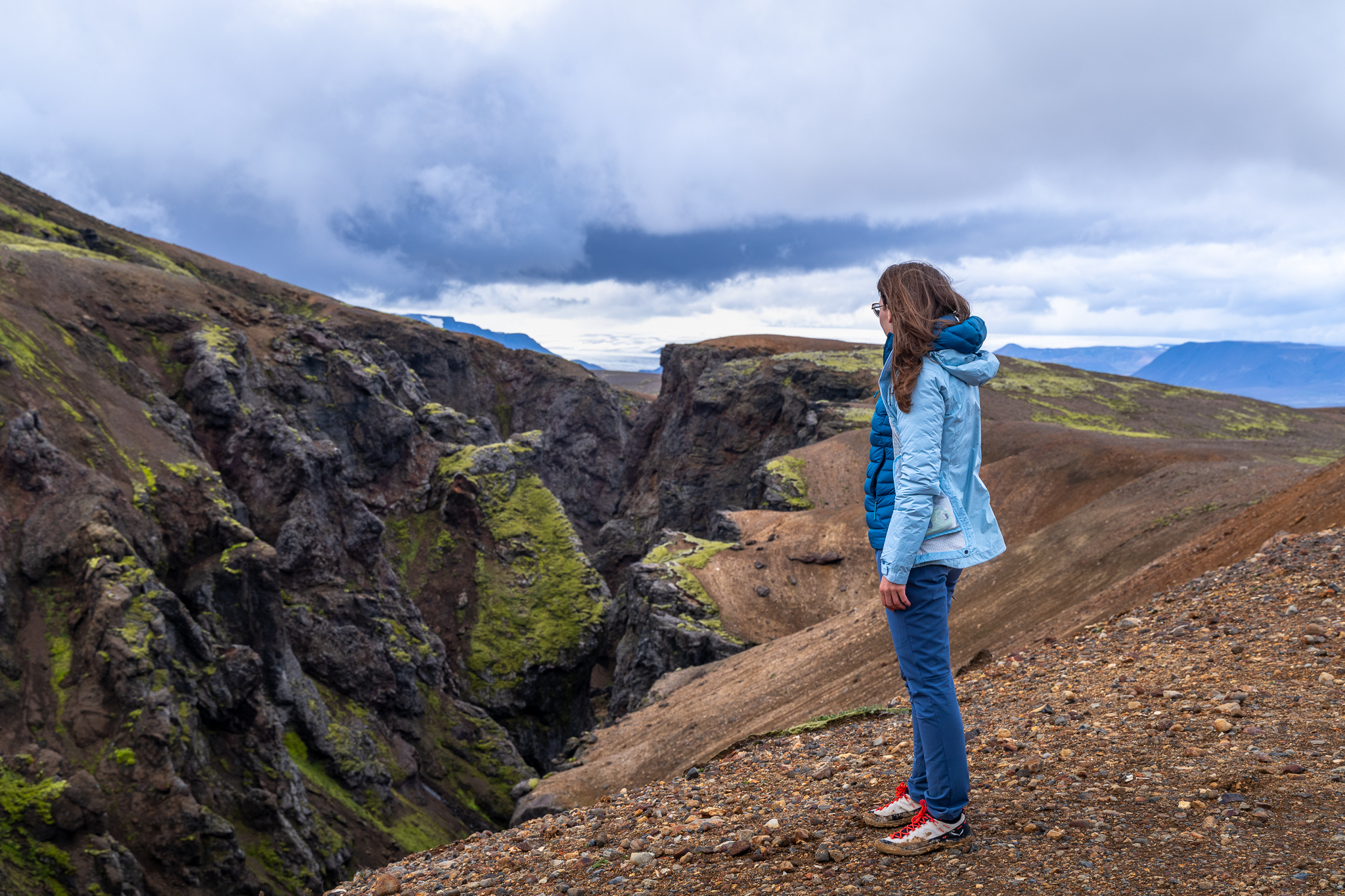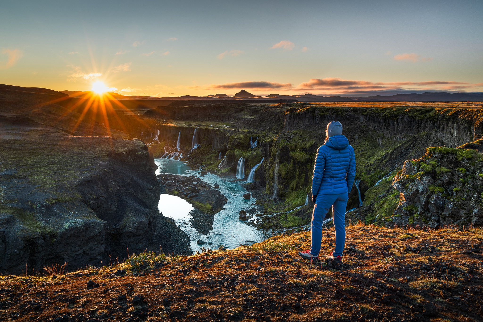 Ze schroniska ruszyliśmy już o 5:30, co było świetną decyzją, gdyż pewna pogoda miała być do około godziny 17/18, następnie miał wejść front deszczowy, który utrzymał się finalnie przez cały kolejny dzień. Biorąc pod uwagę ten fakt oraz świetną kondycję grupy, zaproponowałem dłuższą turę, aby wejść jeszcze na szczyt zaplanowany właśnie na kolejny dzień. W innym przypadku nie byłoby to możliwe. Wszyscy zareagowali z zadowoleniem, choć zdawali sobie sprawę z długości i trudu dnia. Poranek był całkowicie bezchmurny, co jak na Thorsmork jest prawdziwym cudem – było fantastycznie. Brak wiatru, przepiękne kolory wschodu słońca, dzika przyroda i my sami na szlaku – romantyzm w pełnym wydaniu! Takie warunki utrzymały się praktycznie przez większość dnia. Pierwszym celem trekkingu było wejście na kratery wulkaniczne: Magni i Modi, które powstały w trakcie potężnej erupcji Eyjafjallajökull w 2010 roku. Tak, to ten wulkan, który sparaliżował lotnictwo w Europie. Jednak prawdziwe smaczki były dopiero przed nami, a dokładnie wąwóz Hvannargil! Moje ulubione miejsce całej wycieczki, ależ on jest piękny! Mało znany wśród turystów, większość go po prostu pomija, a jest wyjątkowo piękny. Nie spotkaliśmy w nim nikogo, a otaczała nas przepiękna zieleń, rzeki lodowcowe i spektakularne ściany wąwozu ze skał wulkanicznych. Widoki jak z innej planety, takie – których nigdzie indziej nie da się zobaczyć. Tego dnia, choć już zmęczeni weszliśmy jeszcze na Útigönguhöfði i dokończyliśmy spacer wąwozem. To był w sumie plan kolejnego dnia, jednak jak już wspomniałem – nie byłoby on wykonalny z powodów pogodowych. Całość trekkingu to aż 23 km i 1800 sumy podejść! Kawał solidnego dnia, choć dla wprawnych, tatrzańskich turystów można powiedzieć, że to dzień jak codzień.