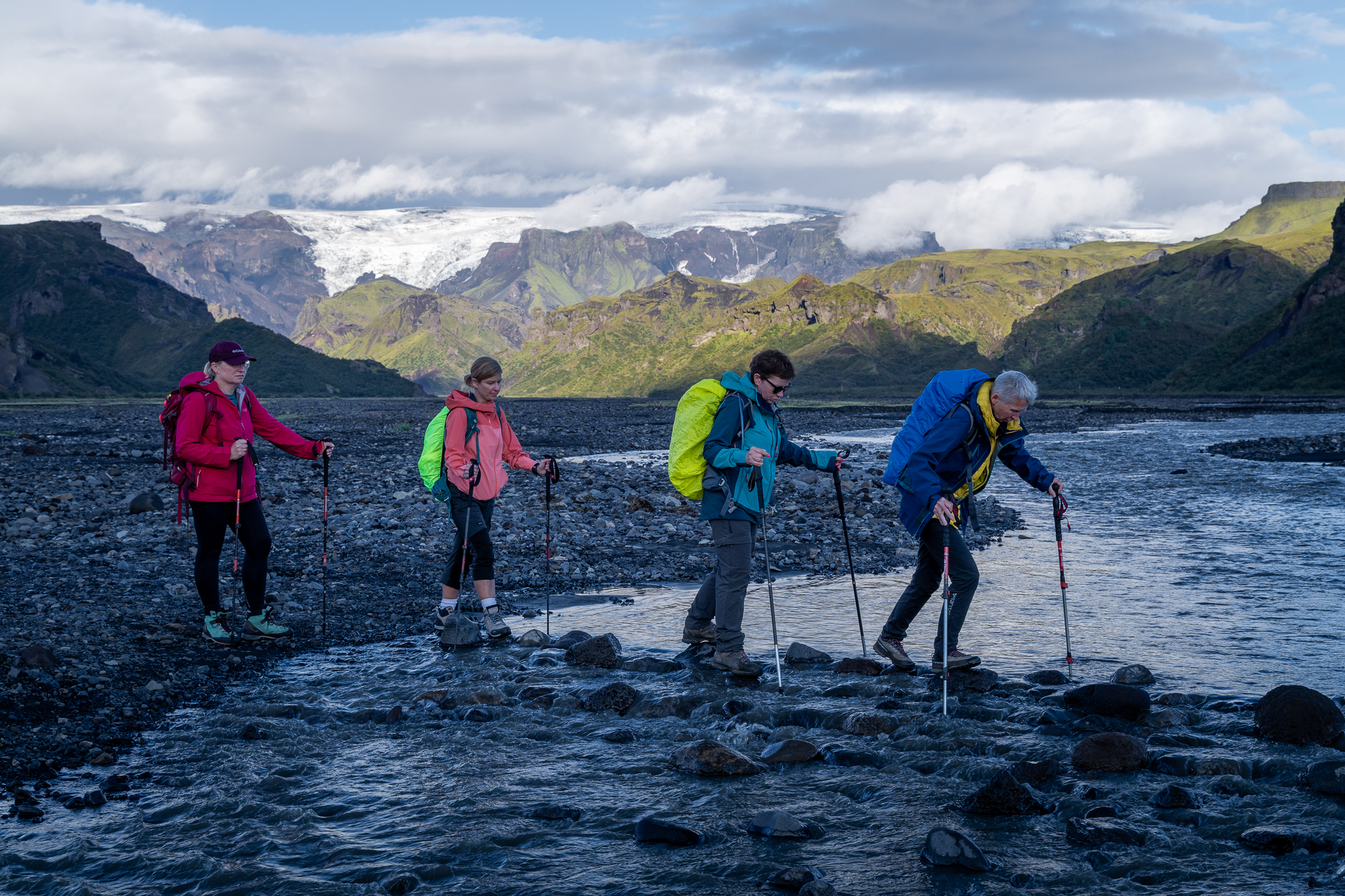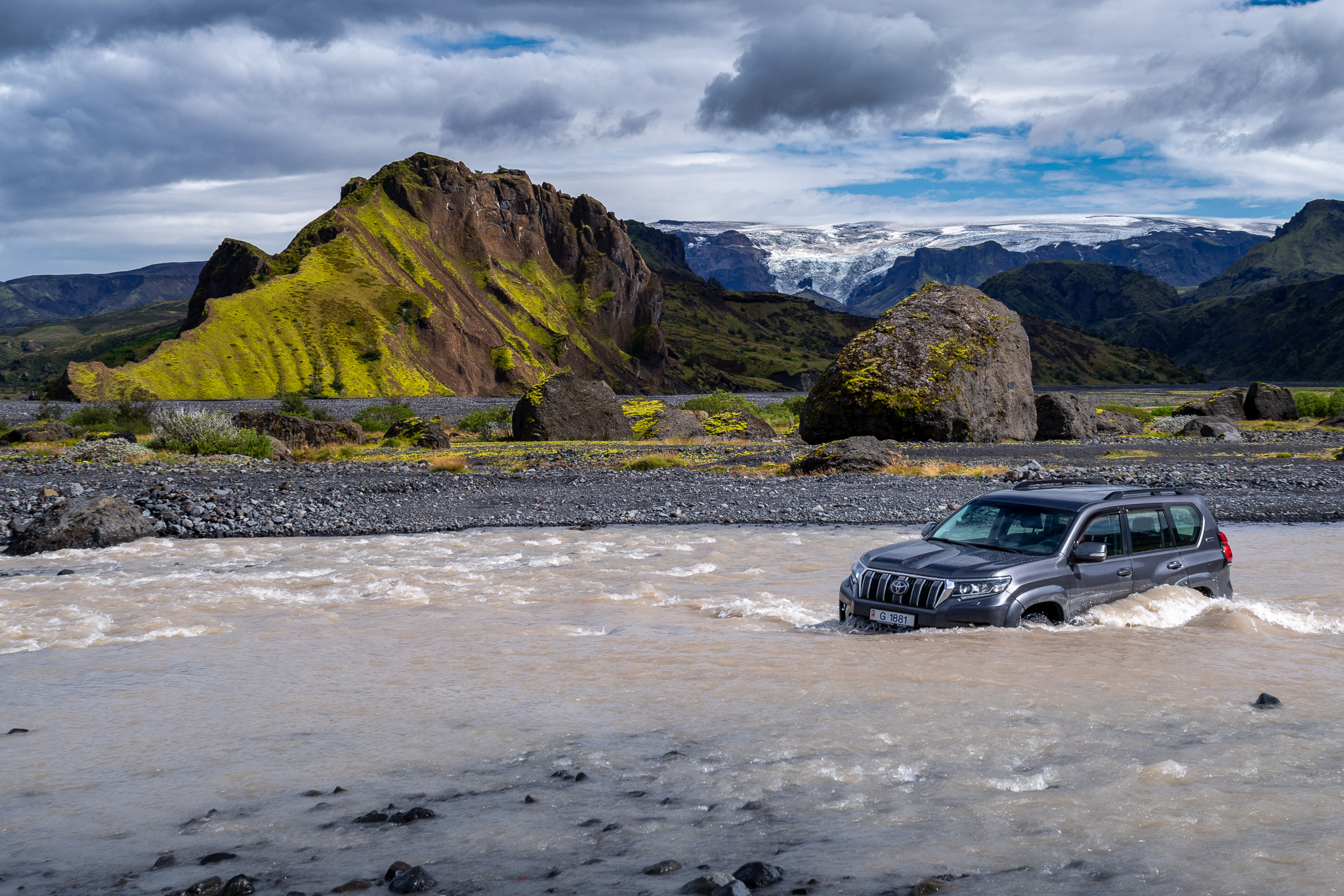 Dlaczego zdecydowałem się na autobus? Po pierwsze, aby oszczędzić czas – a po drugie, aby dotrzeć do naszego miejsca noclegu niezależnie od warunków pogodowych. Przejście od Skogar też wchodziło w grę, ale gdyby w ten dzień trafiła się kiepska pogoda, a w busach nie było miejsca, no cóż – zostalibyśmy na ulicy i to dosłownie. Drogą F249 nie można poruszać się autami z wypożyczalni, a zalecane opony to aż 35 cali! Nawet nie brałem pod uwagę samodzielnego przekraczania rzek ze względów bezpieczeństwa. To miejsce zna wiele historii, gdzie turyści utopili samochody, nie brakowało niestety także wypadków śmiertelnych, po czym droga oficjalnie została zamknięta dla takich pojazdów. Mimo wszystko wciąż można je tam spotkać, jeden utopił się dzień przed naszym przyjazdem, na szczęście nikomu nic się nie stało. Cała ta otoczka dodaje niesamowitego kolorytu, co stanowi świetną przygodę – dlatego nasza grupa pojechała do Thorsmorku właśnie specjalnie przygotowanym autobusem do przekraczania najtrudniejszych rzek Islandii!