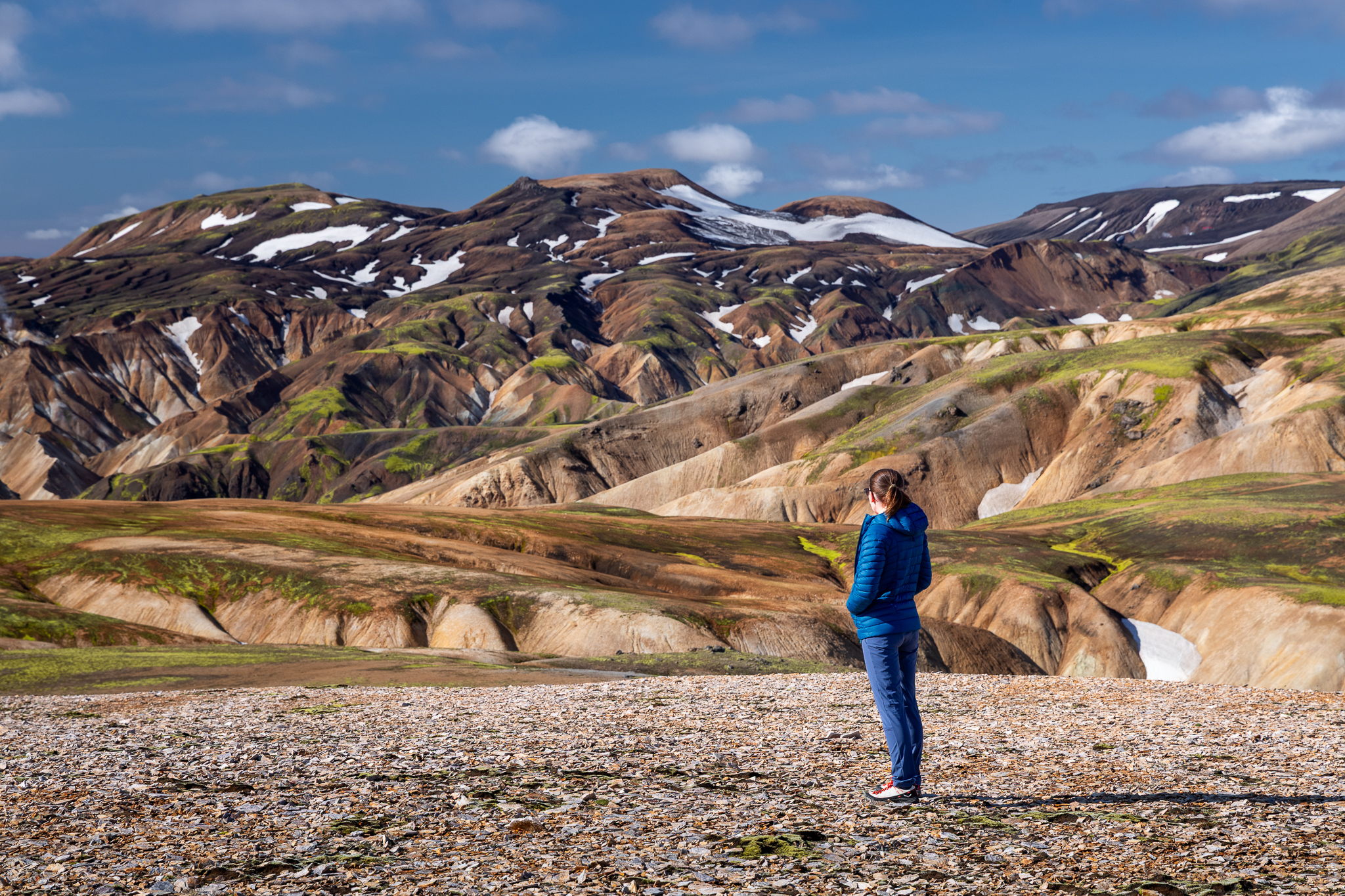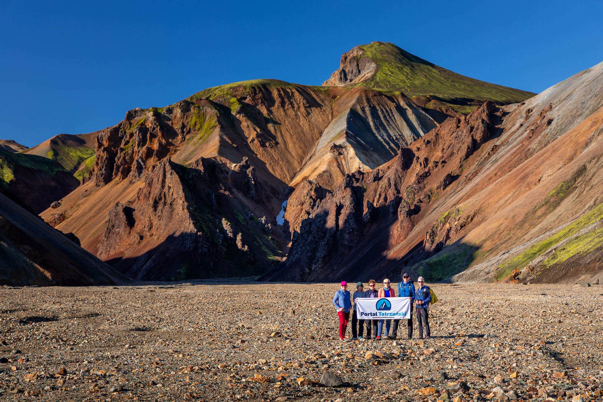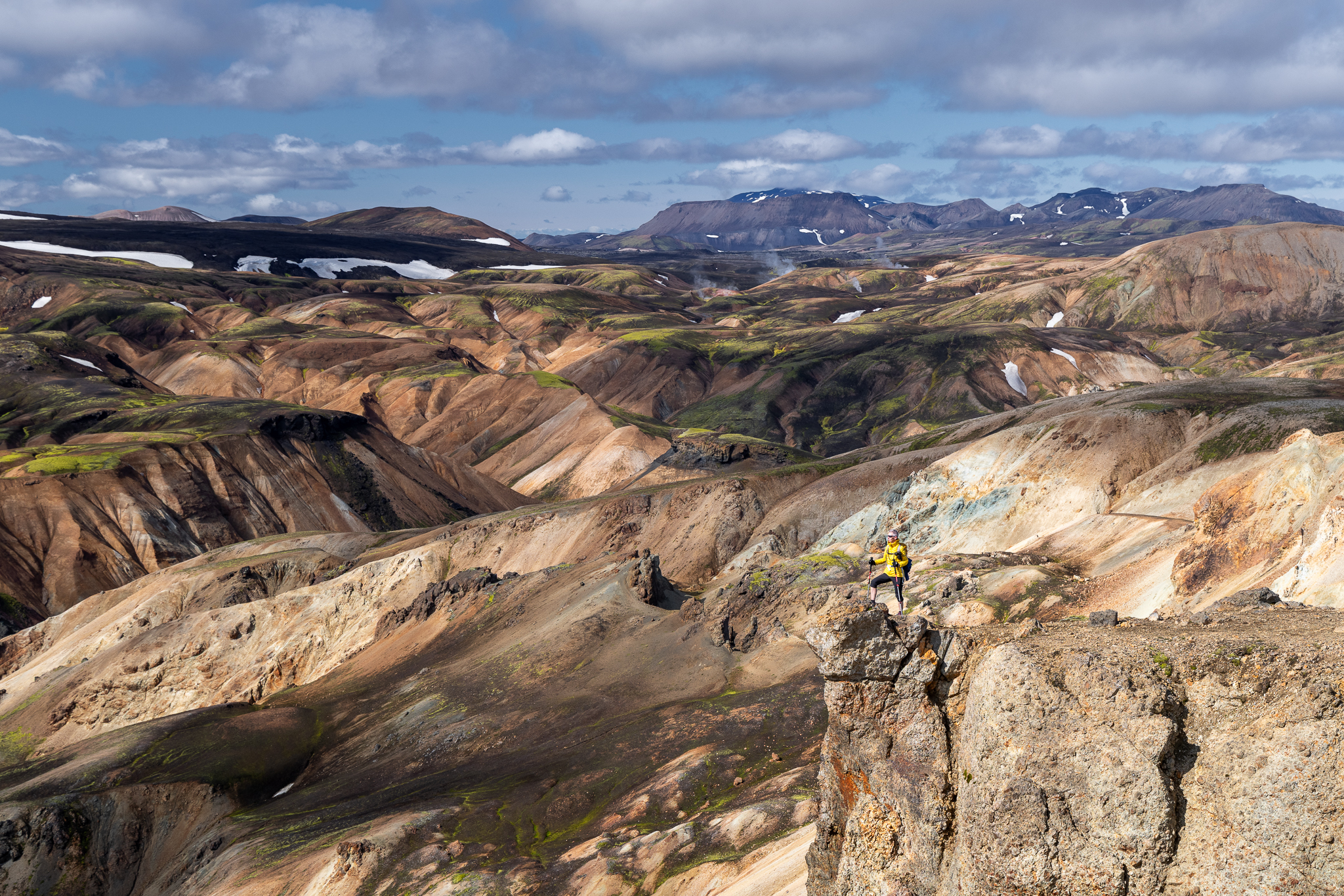 Ostatnie dwa dni mieliśmy spędzić tylko w Landmannalaugar, jednak pogoda była tak dobra, że w zasadzie zobaczyliśmy wszystko w jeden. Nie, nie przeszliśmy dwóch zaplanowanych tras, gdyż nie byłoby to fizycznie możliwe, jednak panoramy były tak rozległe, że grupa nasyciła się już w trakcie pierwszego kontaktu. Jako to, że zawsze reaguję i dostosowuję plan do grupy, wpadłem na nieco szalony pomysł z dużą korzyścią dla gości mojej wycieczki. Zaproponowałem im zmianę i zakończenie wyjazdu w Kerlingarfjöll. Wiązało się to z odkryciem nowego miejsca, ale nieco krótszym trekkingiem, tam po prostu nie ma możliwości odbyć aż takich tras jak w Landmannalaugar. Mimo to jest to miejsce całkowicie z innej bajki, choć powstało tak samo, to źródła geotermalne są tam znacznie bardziej aktywne, dzięki czemu całość wygląda jeszcze bardziej abstrakcyjnie! Efekt? Grupa była zachwycona zmianą, a ja ucieszyłem się, że mogłem sprawić im przyjemność. O to właśnie moim zdaniem chodzi w tej pracy – o elastyczność i umiejętność dostosowania się do panujących warunków.