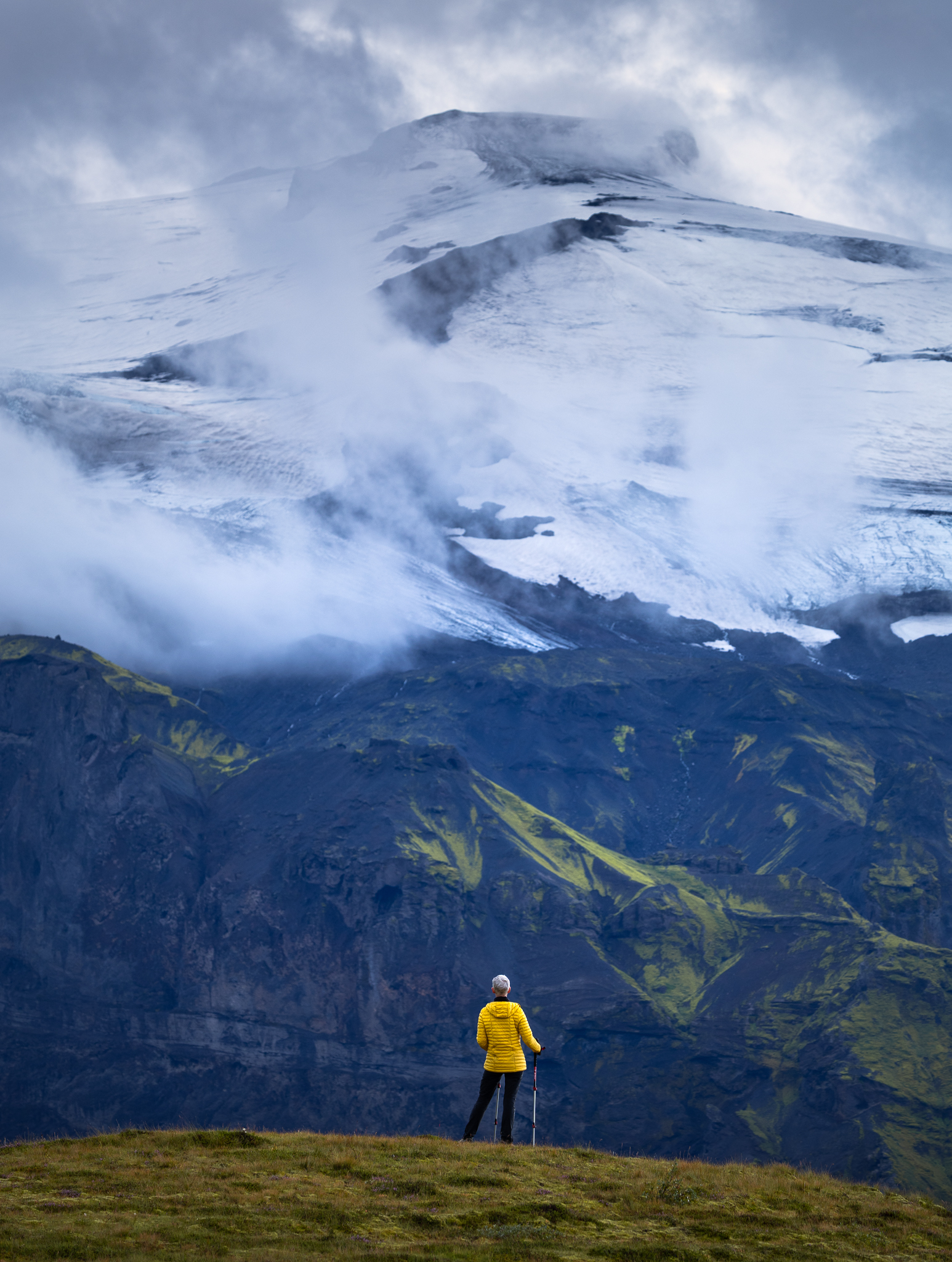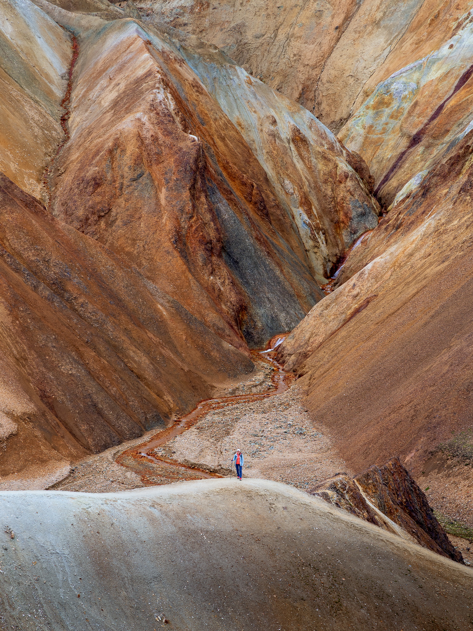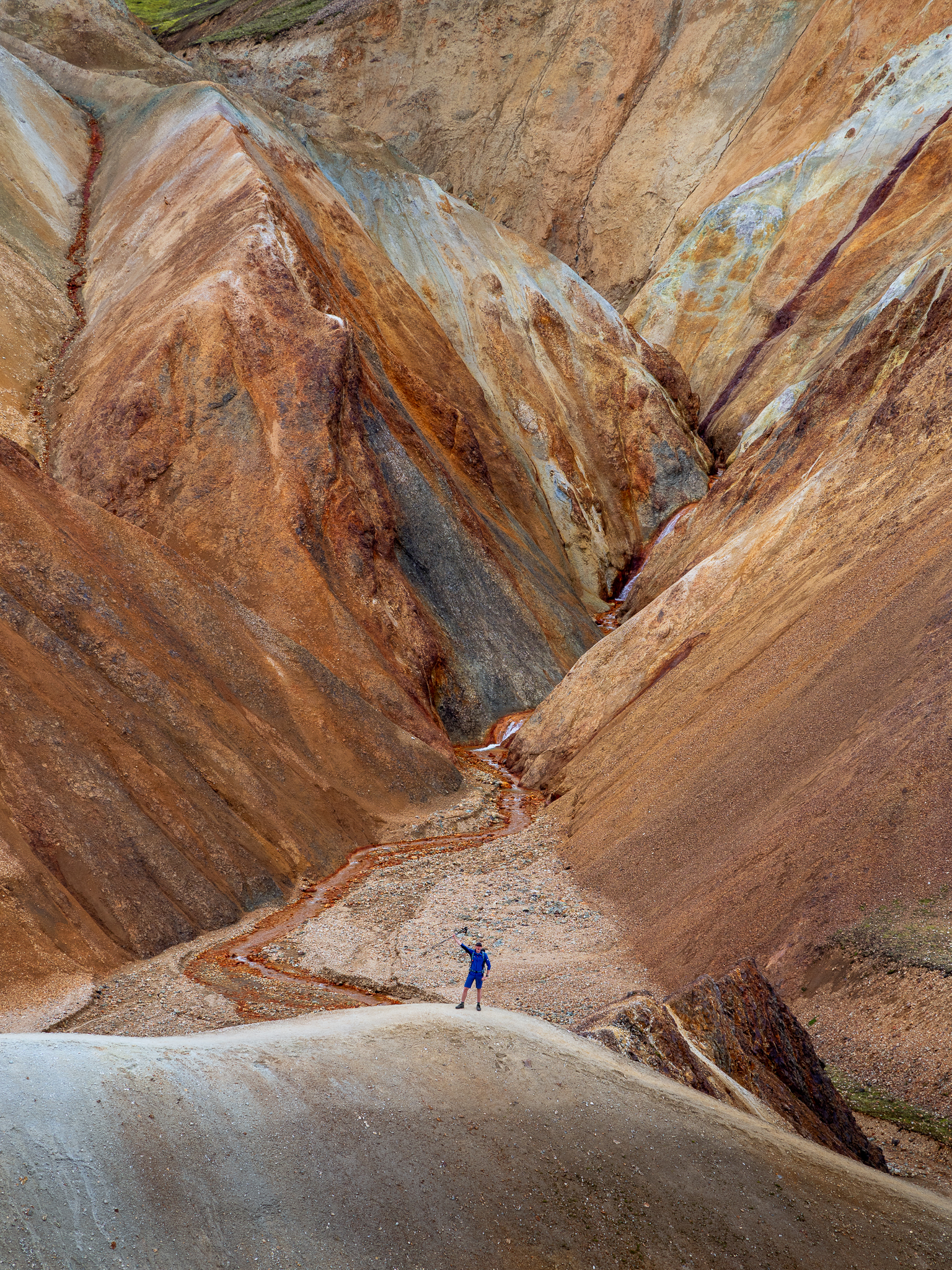 Ostatnie dwa dni mieliśmy spędzić tylko w Landmannalaugar, jednak pogoda była tak dobra, że w zasadzie zobaczyliśmy wszystko w jeden. Nie, nie przeszliśmy dwóch zaplanowanych tras, gdyż nie byłoby to fizycznie możliwe, jednak panoramy były tak rozległe, że grupa nasyciła się już w trakcie pierwszego kontaktu. Jako to, że zawsze reaguję i dostosowuję plan do grupy, wpadłem na nieco szalony pomysł z dużą korzyścią dla gości mojej wycieczki. Zaproponowałem im zmianę i zakończenie wyjazdu w Kerlingarfjöll. Wiązało się to z odkryciem nowego miejsca, ale nieco krótszym trekkingiem, tam po prostu nie ma możliwości odbyć aż takich tras jak w Landmannalaugar. Mimo to jest to miejsce całkowicie z innej bajki, choć powstało tak samo, to źródła geotermalne są tam znacznie bardziej aktywne, dzięki czemu całość wygląda jeszcze bardziej abstrakcyjnie! Efekt? Grupa była zachwycona zmianą, a ja ucieszyłem się, że mogłem sprawić im przyjemność. O to właśnie moim zdaniem chodzi w tej pracy – o elastyczność i umiejętność dostosowania się do panujących warunków.
