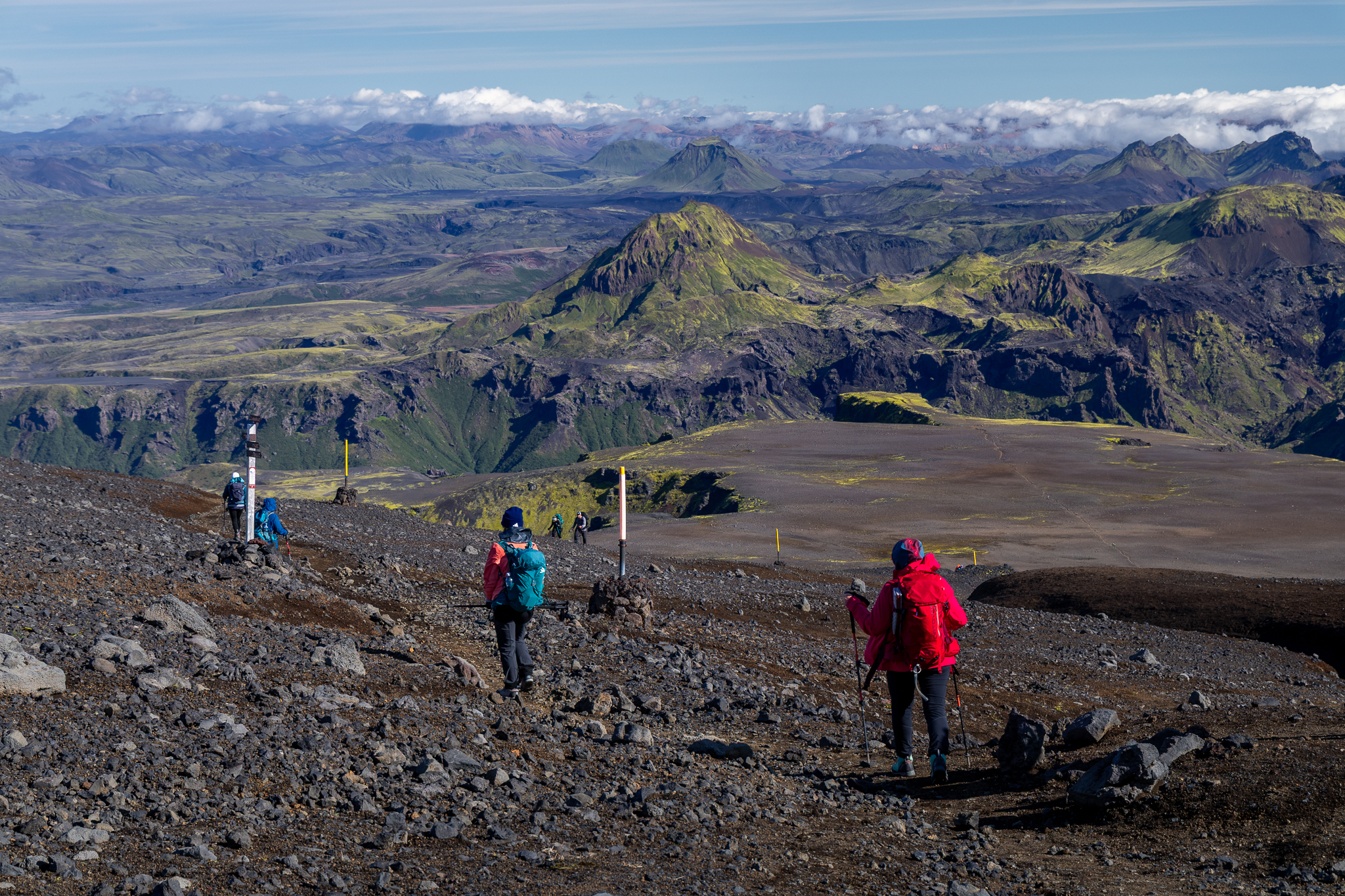 Po rozpakowaniu się i krótkiej przerwie na obiad, udaliśmy się na trekking na Valahnukur. Pogoda zaserwowała nam prawdziwy spektakl. Najpierw słońce, niebieskie niebo i wręcz lejący się żar. Jednak z drugiej strony już zmierzał do nas front deszczowy, który dopadł nas w kolejnym schronisku. Pół godziny czekania i ruszyliśmy dalej, pomimo tego, że lekko kropiło udało nam się dostać suchą stopą do Volcano Huts, gdzie przeczekaliśmy resztę deszczu. Na szczyt weszliśmy już w dobrej pogodzie, a na zejściu aura zmierzała ku bezchmurnej, pokazała się przepiękna tęcza, a słońce znów zaczęło nas ogrzewać. Była to naprawdę piękna, rozgrzewkowa wycieczka przed kolejnym dniem, który był naszym punktem kulminacyjnym wycieczki w tym rejonie.